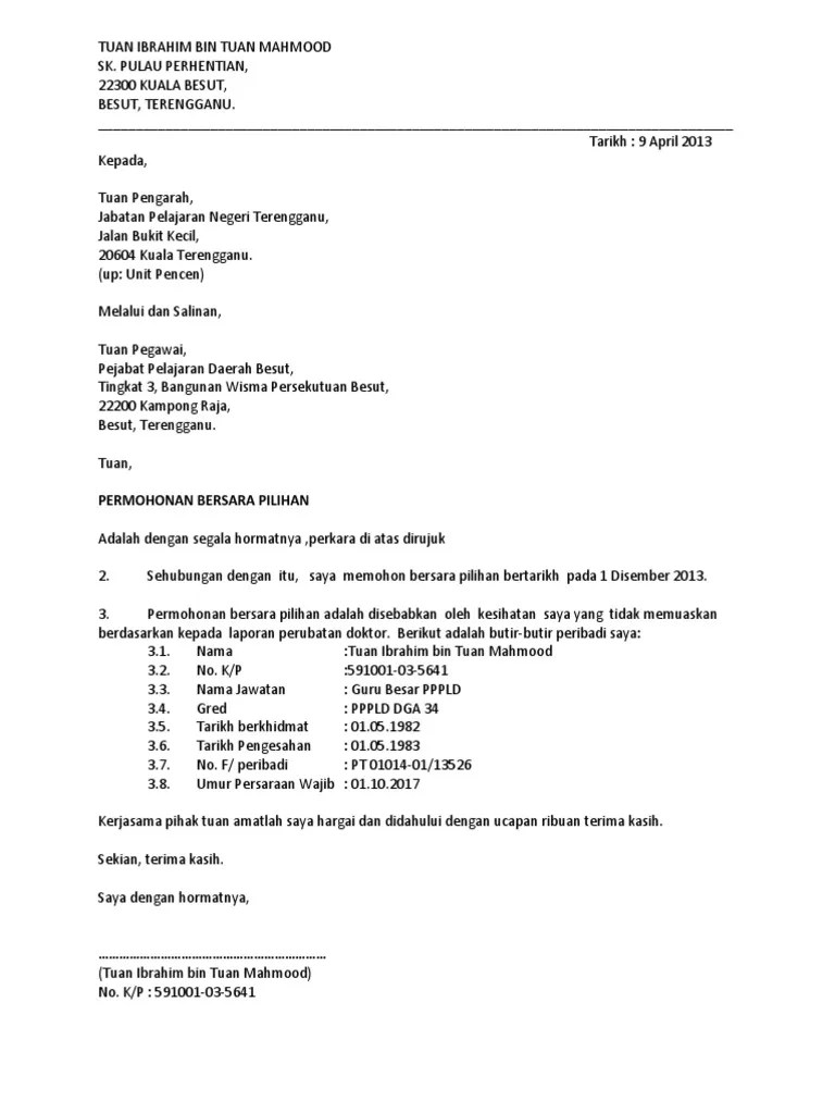 Contoh surat mohon bersara pilihan have a graphic from the other.contoh surat mohon bersara pilihan it also will include a picture of a kind that might be seen in the gallery of contoh surat mohon bersara pilihan. Soalan sains tahun 1 awal. Contoh surat izin pulang lebih awal dari sekolah. Surat memohon kebenaran meminjam peralatan sekolah. Contoh surat somasi terkadang berkaitan dengan pelanggaran perjanjian, perihal penghinaan, hingga hutang piutang. Kumpulan contoh surat permohonan untuk kerjasama, bantuan dana, izin dan keperluan yang lain. Temukan contoh yang kamu cari di sini. Salah satu faktor yang biasanya sering menjadi kendala adalah masalah yang berkaitan dengan finansial atau. Adalah dimaklumkan bahawa jawatankuasa perwakilan pelajar sesi 2018/2019 memohon pertimbangan tuan untuk membenarkan pelajar guru ipg kampus pulau pinang daripada sabah dan sarawak pulang awal ke kampung. Semoga bisa menjadi awal kerjasama yang baik maka dari itu, kami selaku panitia pelaksana kegiatan bermaksud memohon izin guna. Contoh surat bersara awal / sk taman rinting 2. Untuk penulisan alamat, faximiles, telepon, email menggunakan huruf besar di awal kata. Surat permohonan izin di buat untuk memohon izin karena suatu kebutuhan.